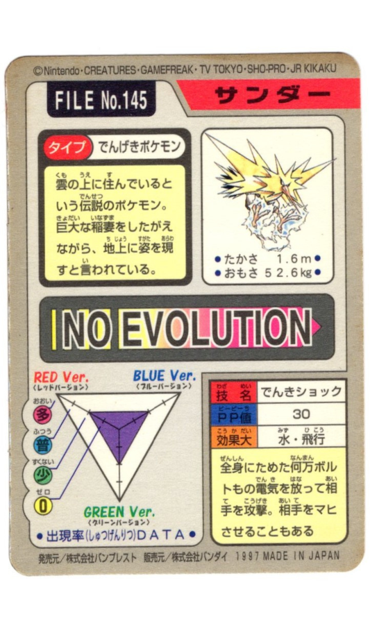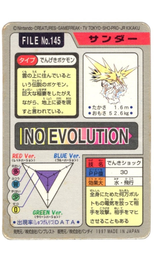 ZAPDOS NO. 145 POKEMON POCKET MONSTERS CARDDASS PRISM HOLO - MP
